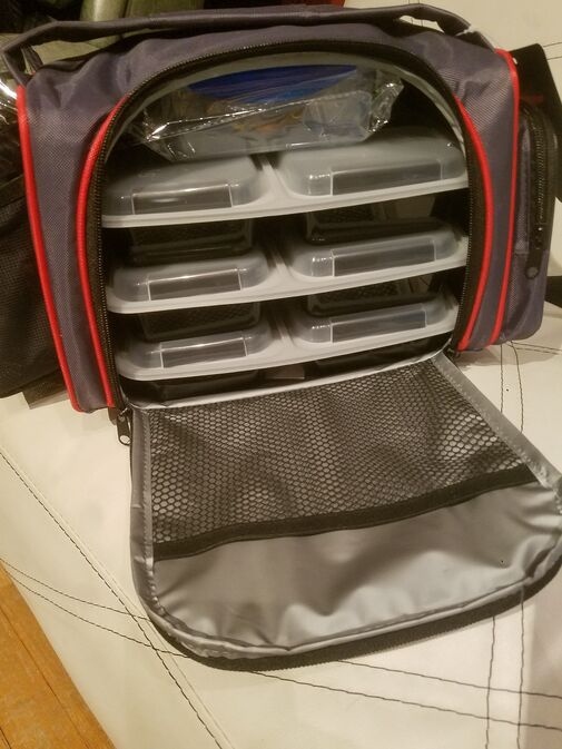So my meal prep stuff came. I was a lil shocked at the size of the bag…but i guess for the purpose of portion control…its perfect . The containers it came with are pretty solid actually and can last a while…the first set of three compartment containers u see there…set of 45…are …bottom is a hair sturdier than the black ones with clear tops u get at the restaurants for left over take home…the cover is a lil bit better but the whole thing i can still see being mistaken for throwing out after 1 use. They close and snap tight pretty good too. I did order another set of 20 coming monday as well that showed a small dumbbell on top of the container which i guess means the should be a whole step above these but still below the ones that came with the bag…those are nice…the clip on the side and inside the top has a rubber bushing u see there to prevent spills and heep freshness.