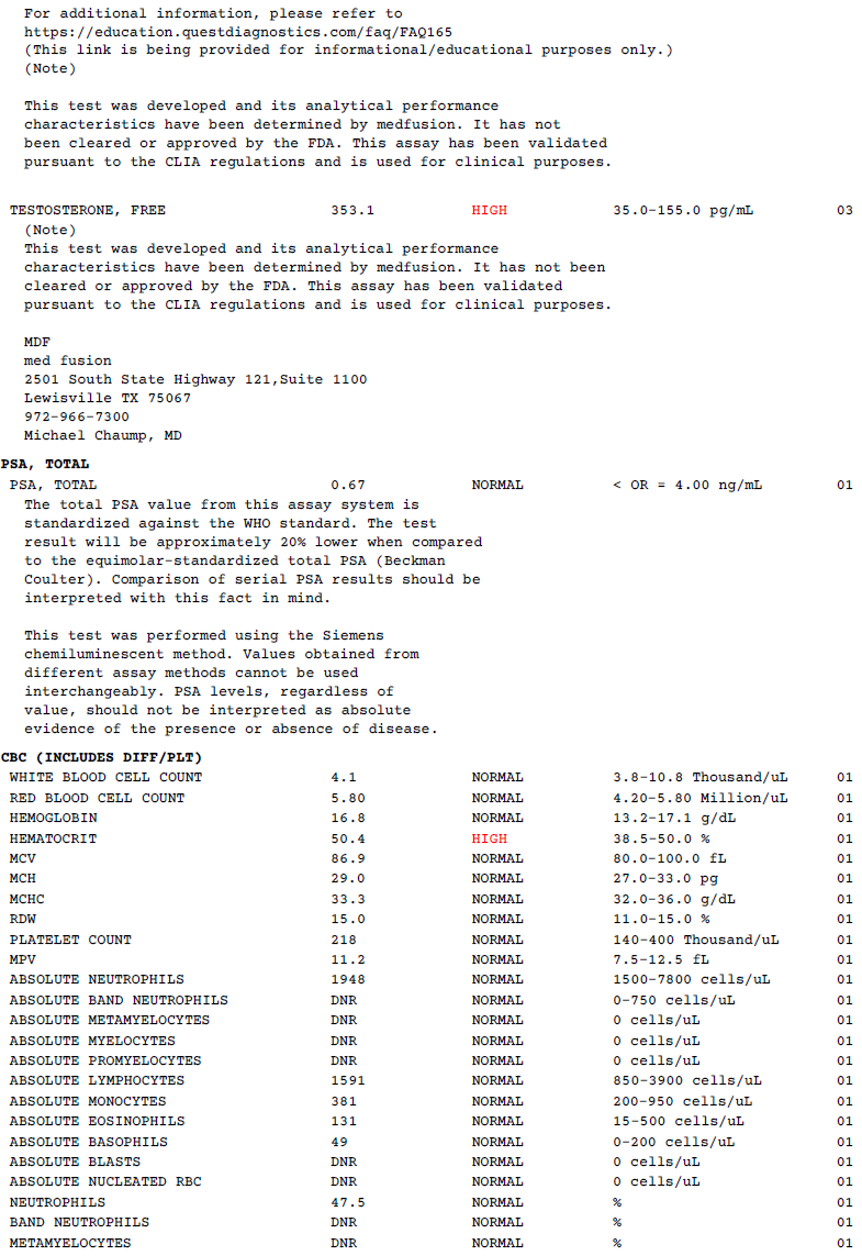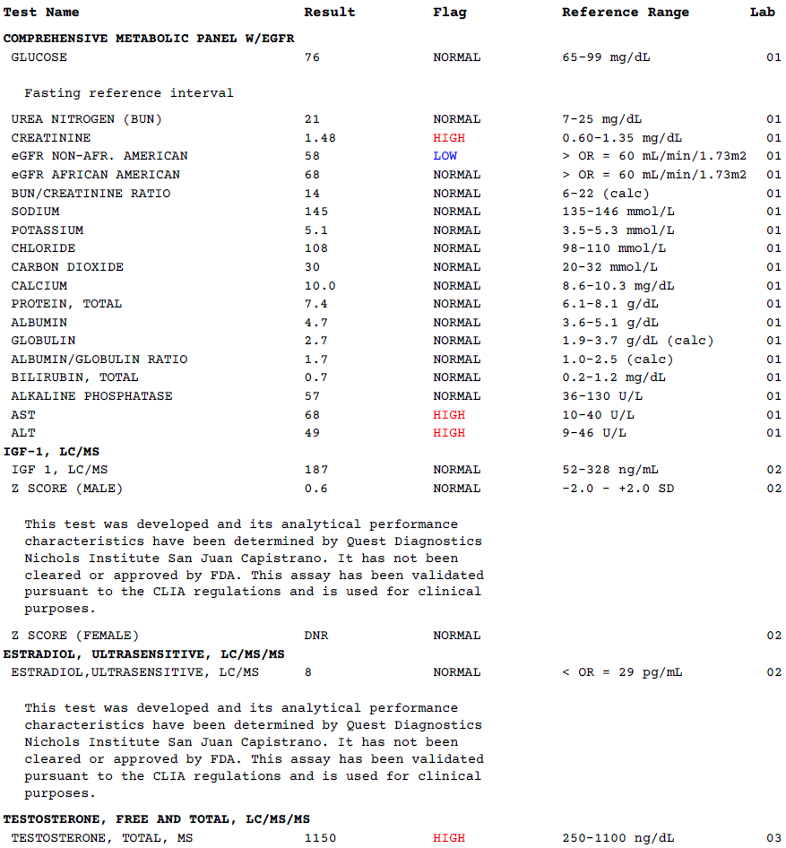 Not too bad. Hemocrit is a bit on the high side, e2 on the low side and not even taking any AI. Easily the most comfortable cycle I’ve ever run with this much stuff. Test numbers aren’t too impressive but free test is super high.