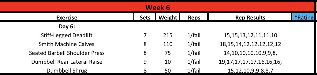 This is the only day this has happened — probably because intensity was so high on the other exercises. Normally I get to the end fine, but peak week is supposed to beat ya up.