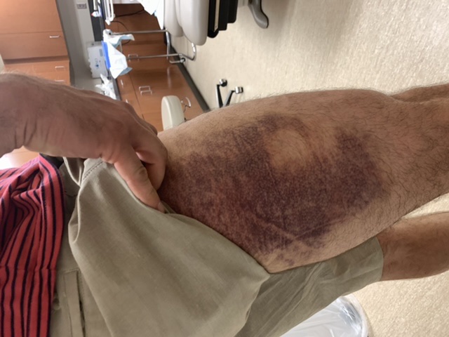 So about ten days ago I injected my own butt and hit one of those hard golf ball sized spots from pip. Then it got bigger and harder then I fell on it and it popped My butt got black and blue over night. I went in to the ER. They did a cat scan and said it is just a huge hematoma and will take months to go away. Today I went in to the docs cause the bruise has moved down my leg and the grapefruit in my butt is regular skin color now. Butt the grapefruit is still there and hasn’t gotten smaller. They injected it with an 18 gauge needle to get a sample and make sure it isn’t infected. It was just blood. Pretty exciting stuff @NeuroRN when I wear shorts it looks like one side of my ass is a lot bigger