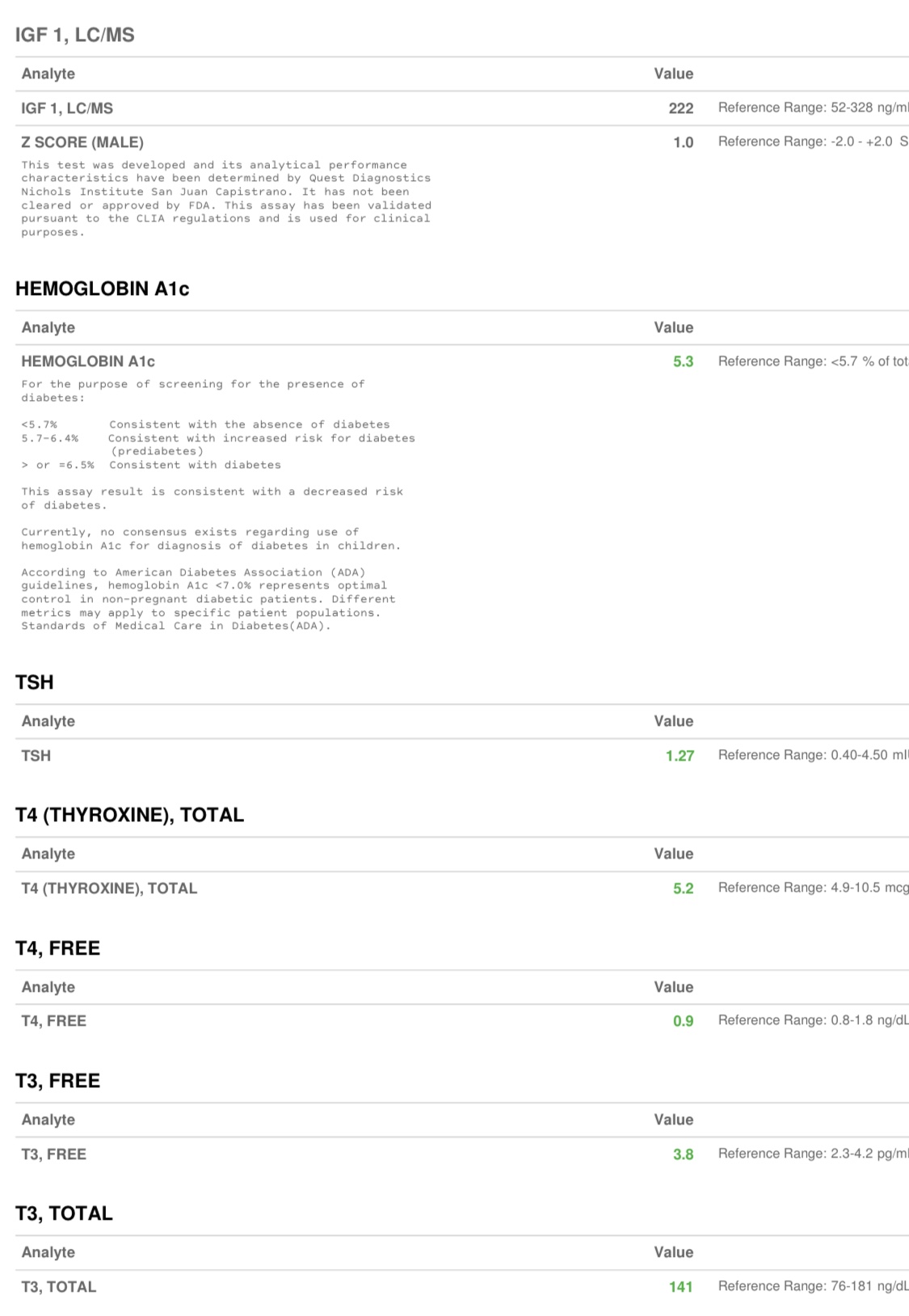 Testosterone results are very good. Been pinning 200 cyp weekly with 100 prop eod . Testosterone is 954 total and 265 free. Photo attached. Also been pinning 4-6 units per day of GH but my IGF 1 is only 222. Thoughts on that?